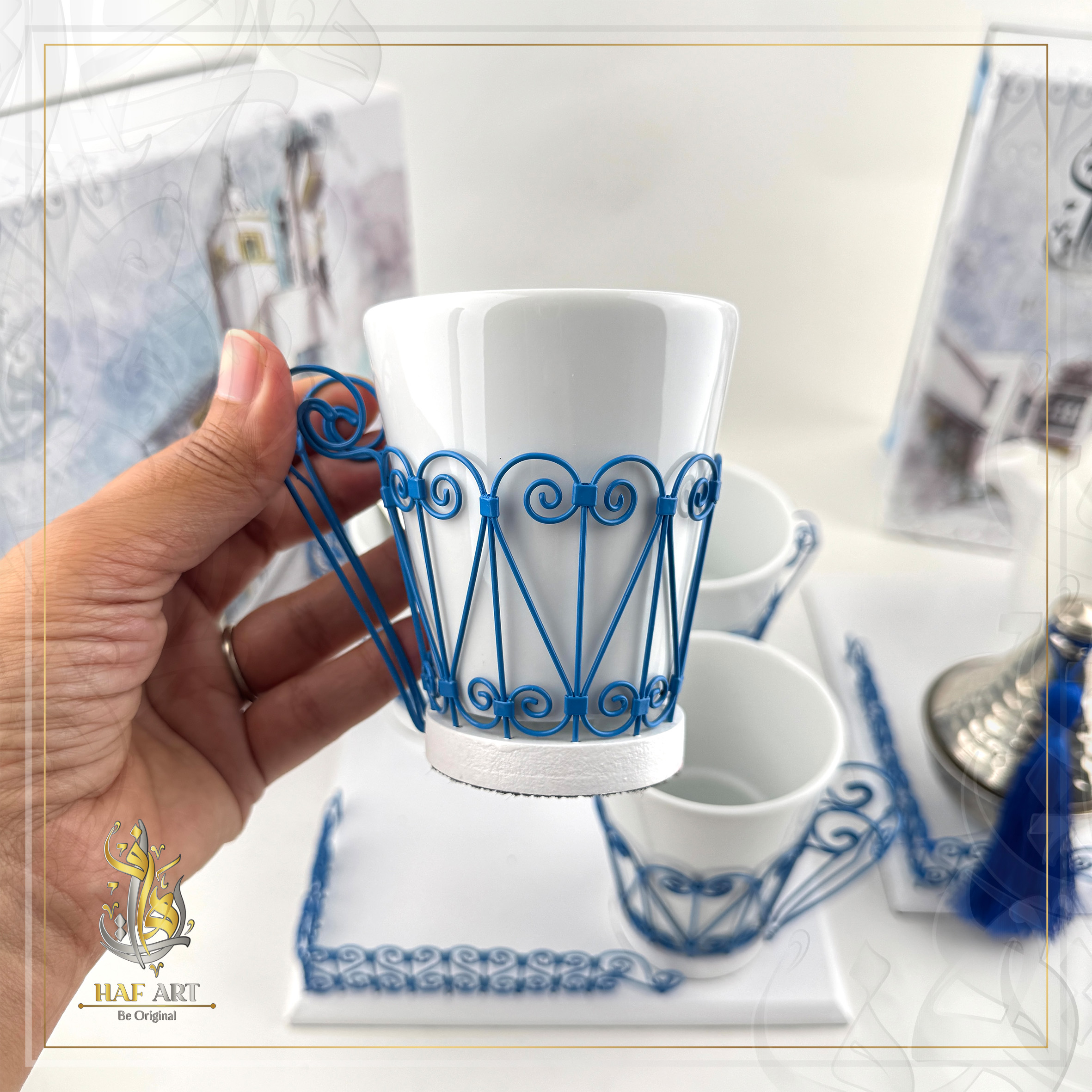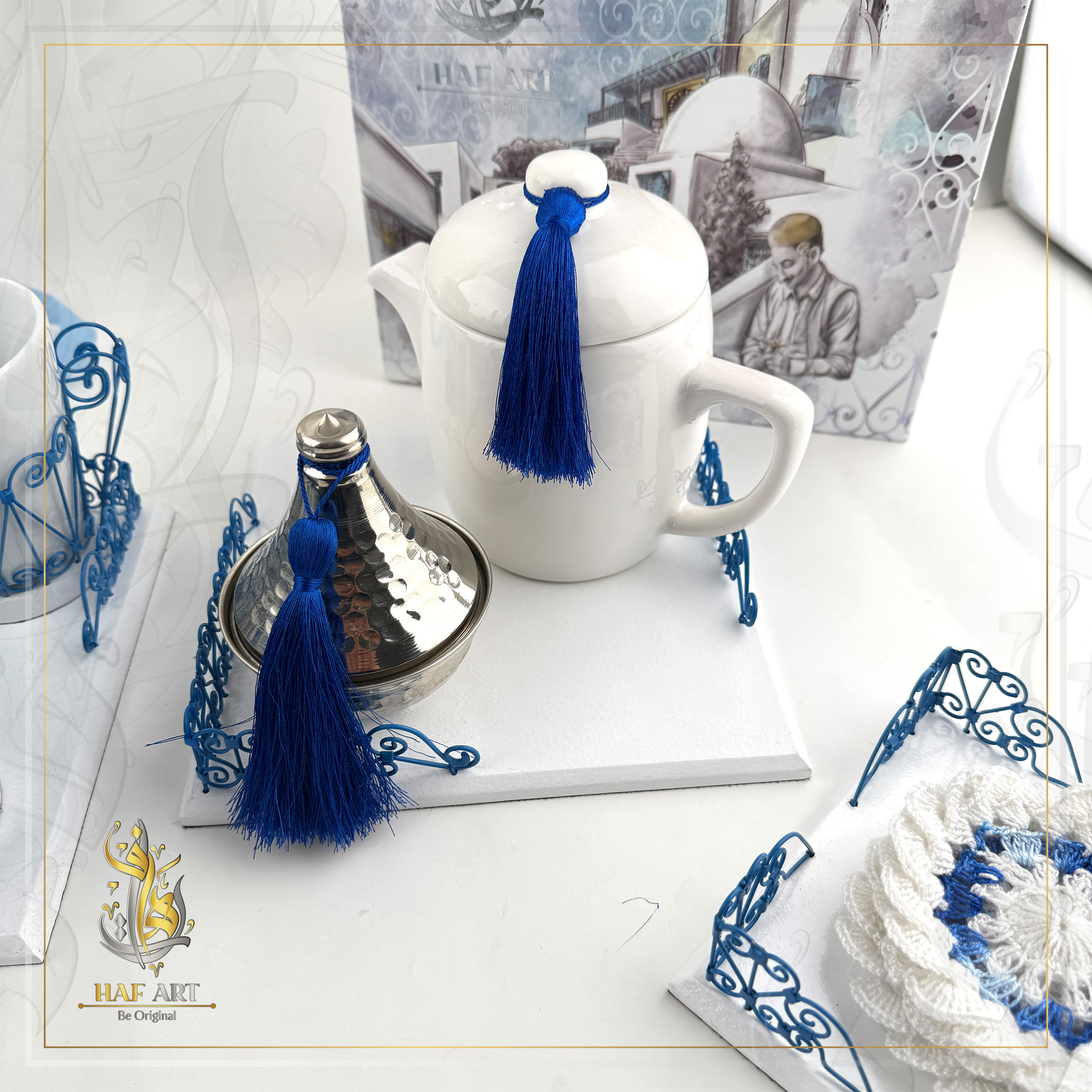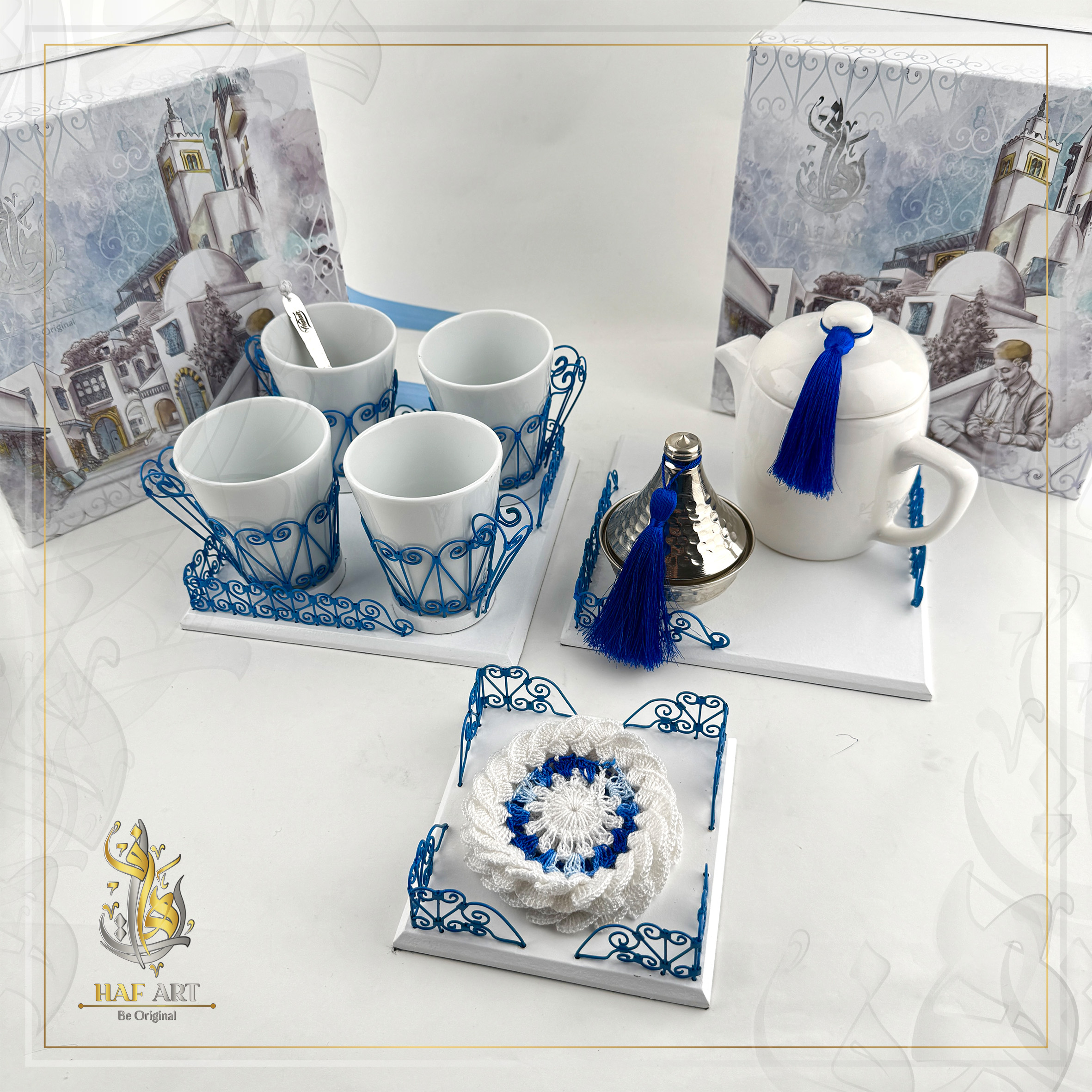 Un ensemble complet inspiré du charme emblématique de Sidi Bou Saïd, alliant élégance artisanale et harmonie des tons bleu et blanc. Idéal pour recevoir avec raffinement.
