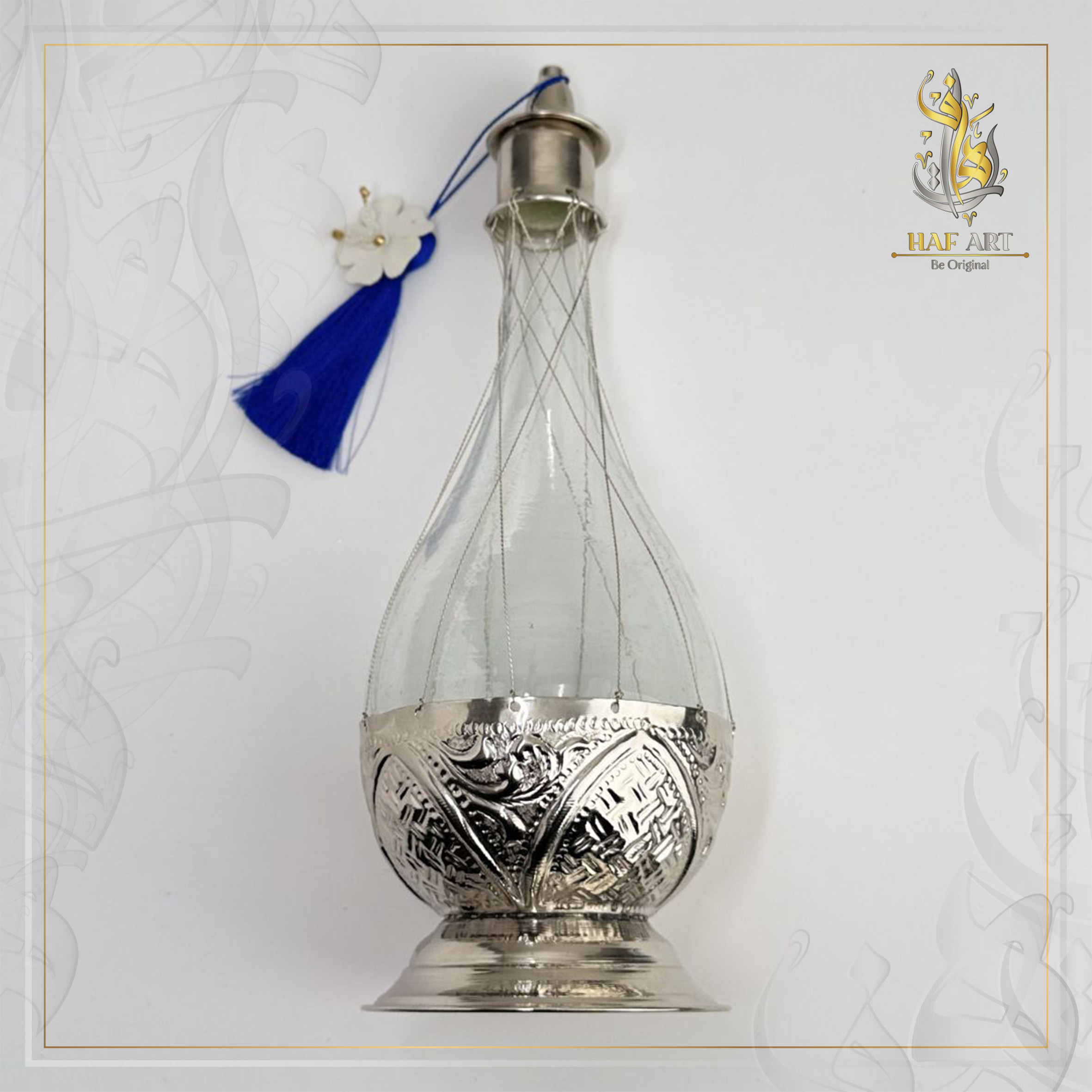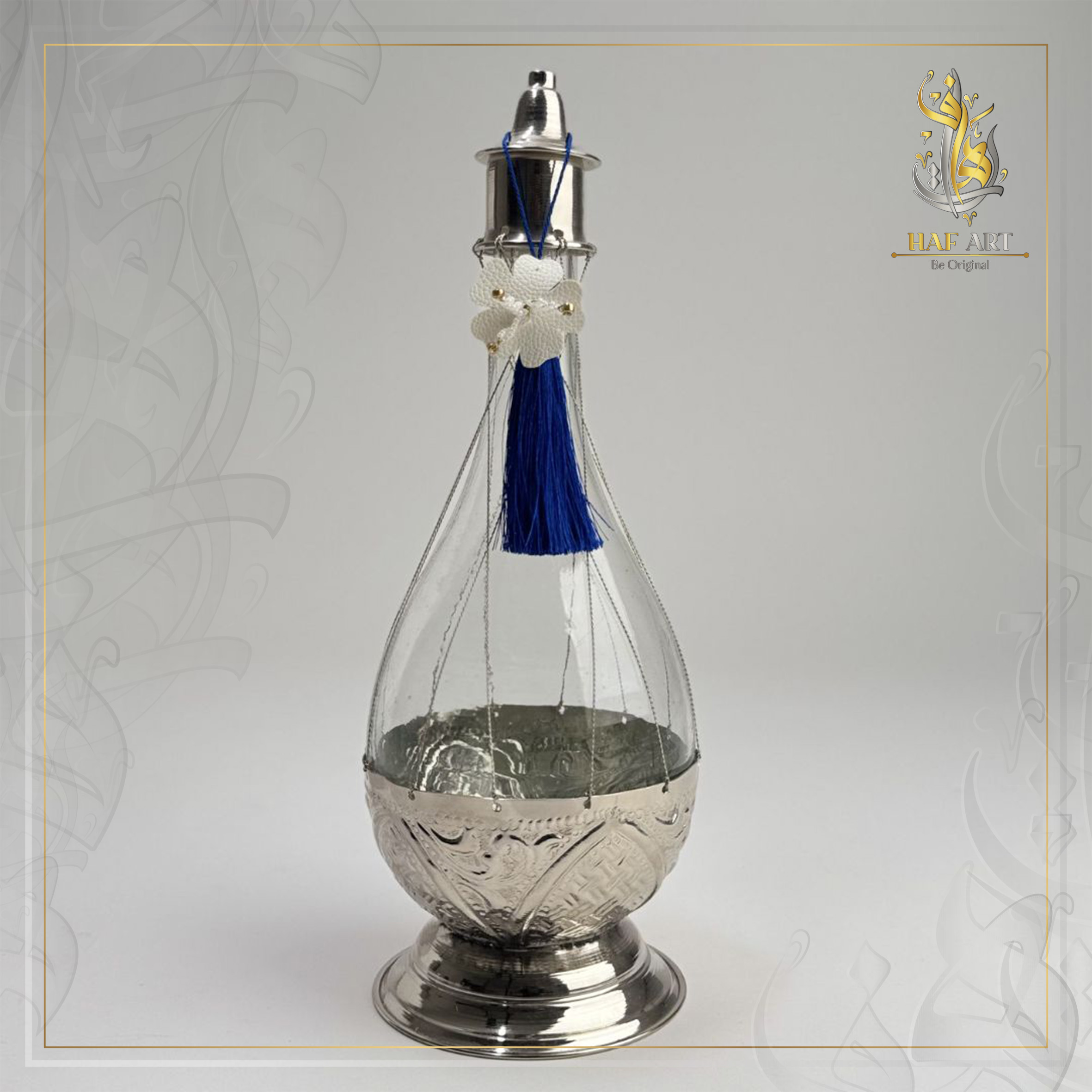 Les deux flacons en verre, délicatement entourés de fils en argent et posés sur une base en cuivre martelé, sont conçus pour accueillir eau de fleur d’oranger, eau de rose ou autres essences parfumées. Leur forme élancée apporte une présence visuelle forte tout en restant raffinée.