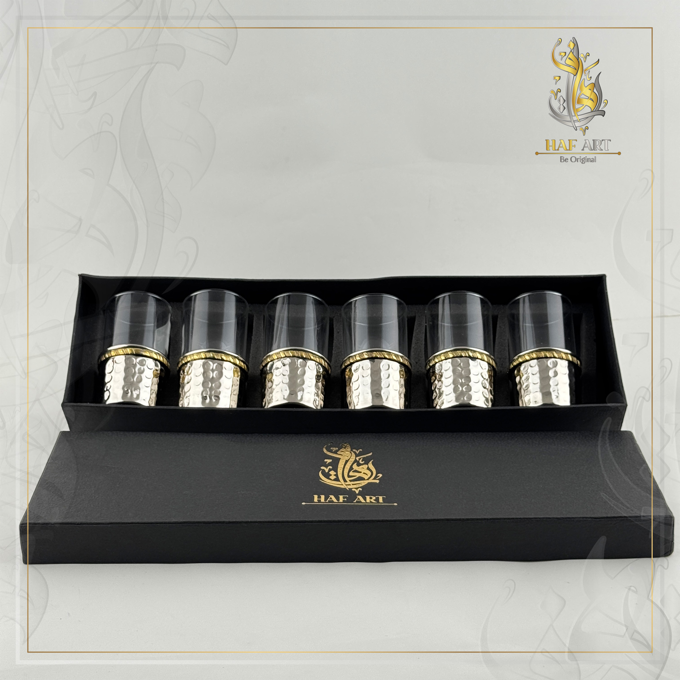 Coffret raffiné composé de 6 verres à thé, chacun habillé d’un support en cuivre martelé finition argentée avec liseré doré.