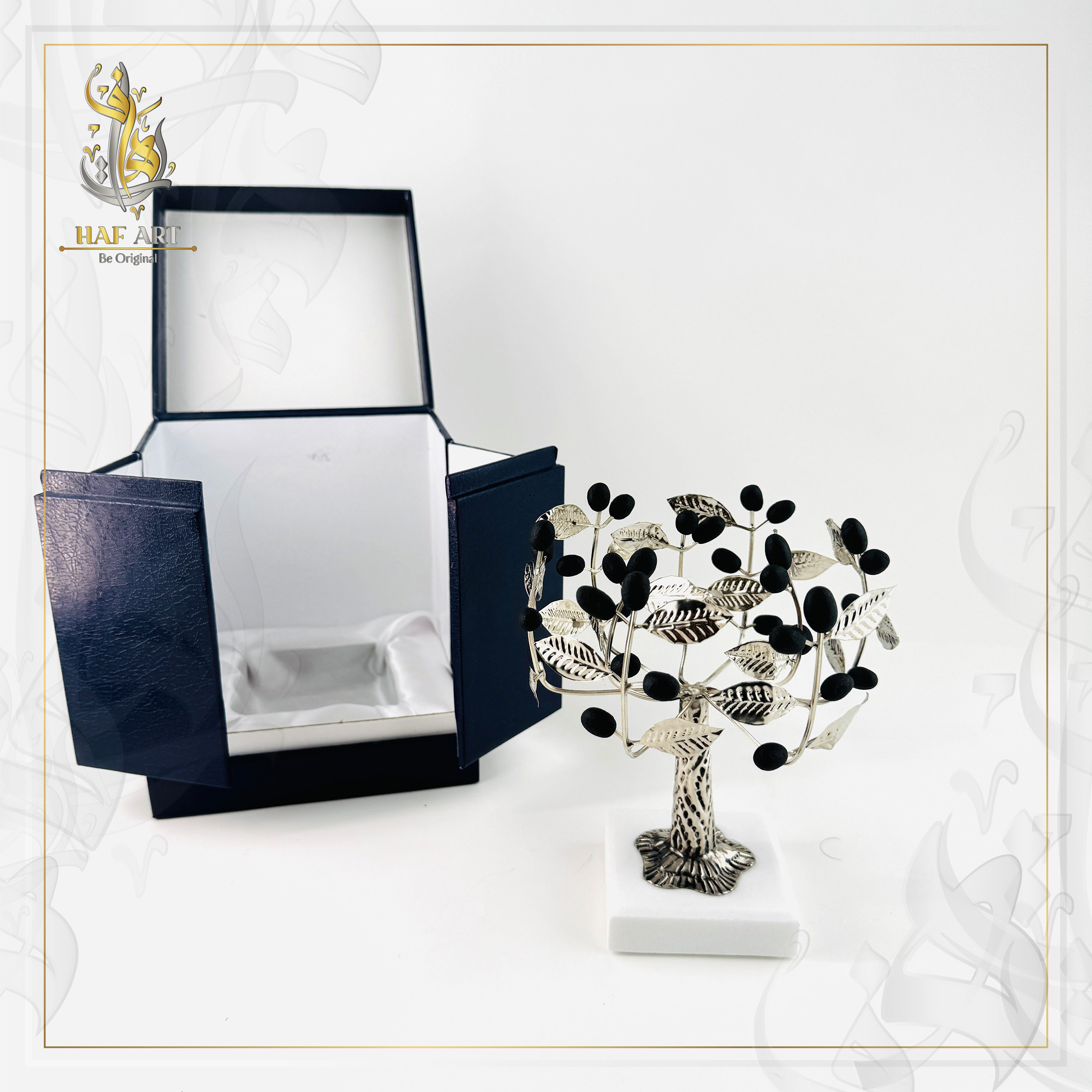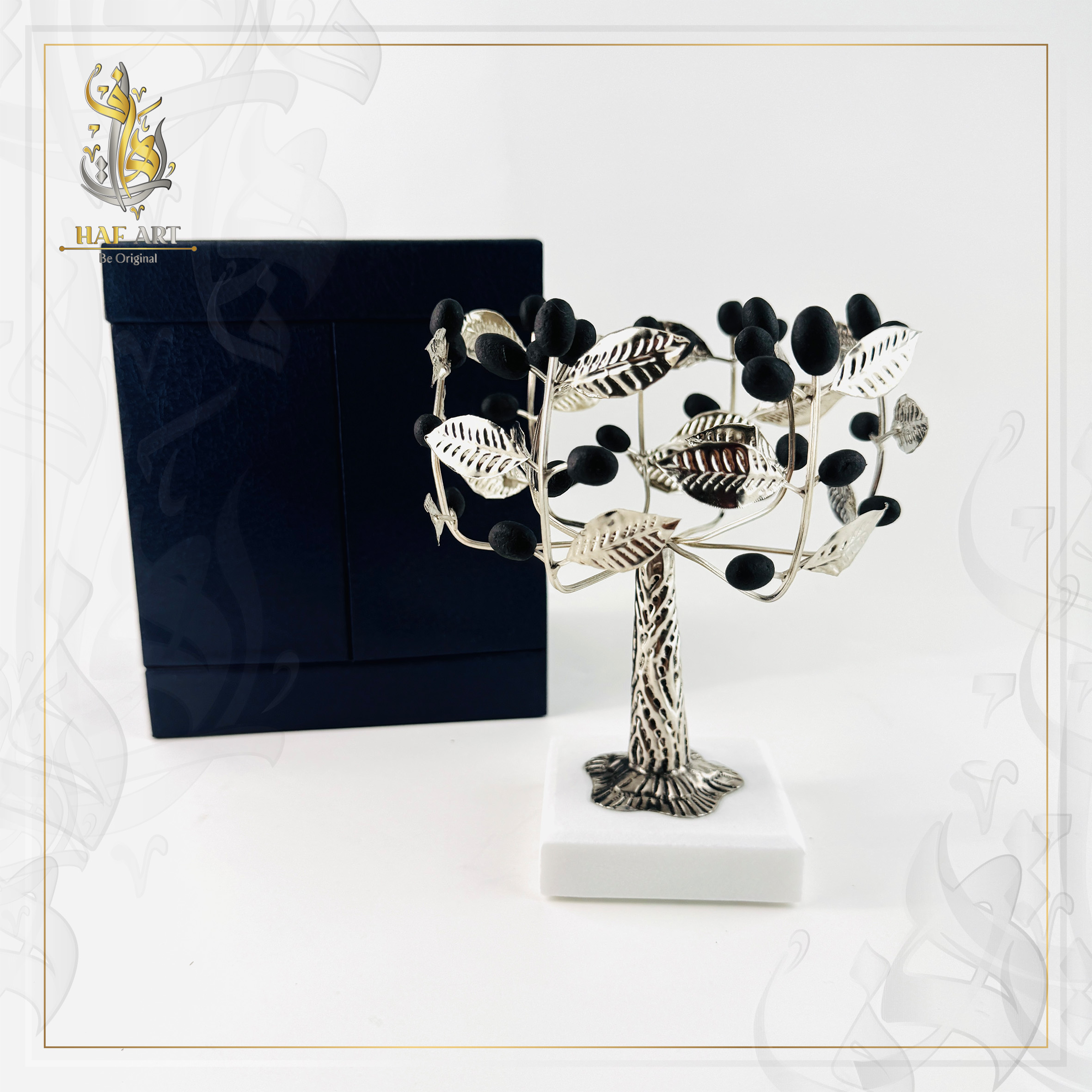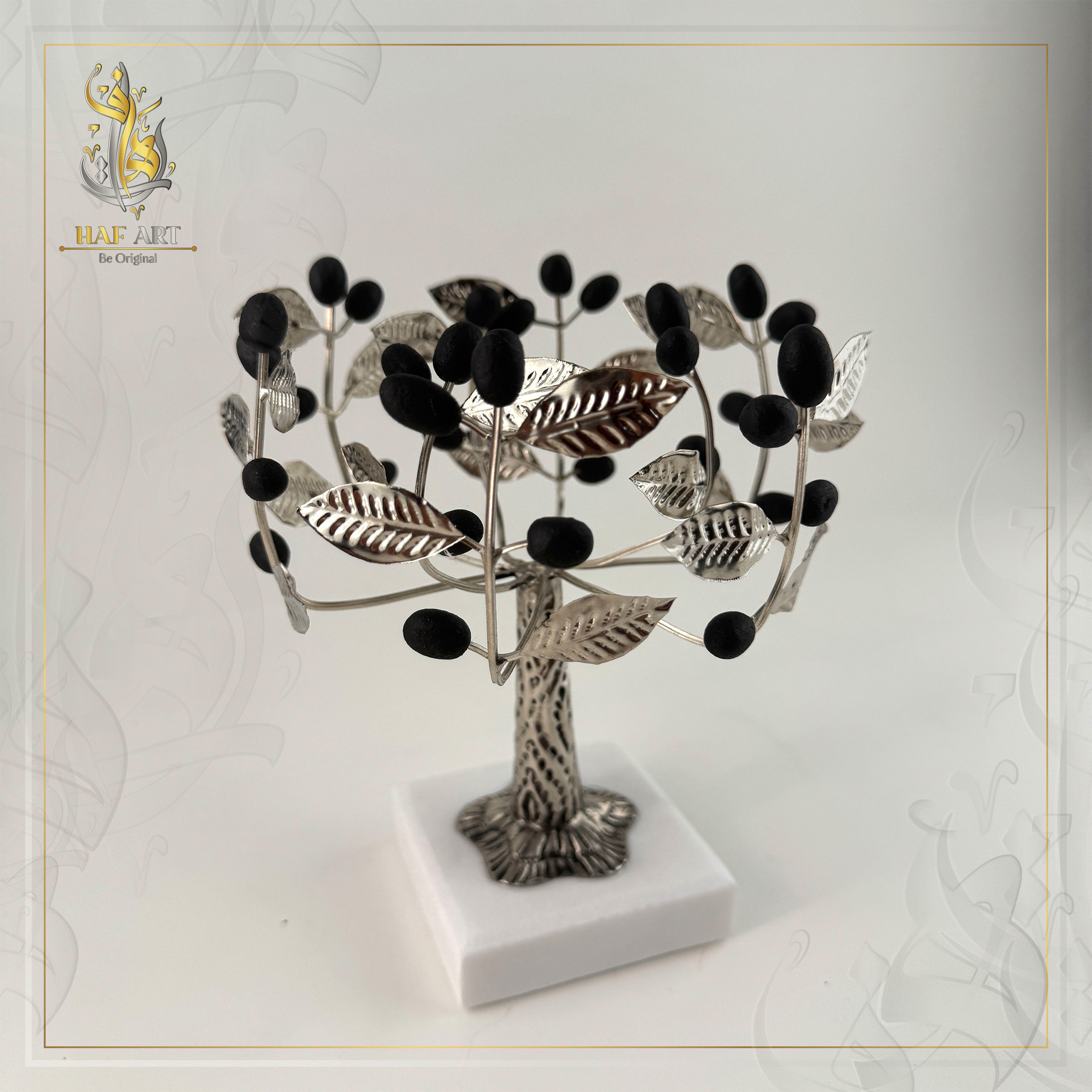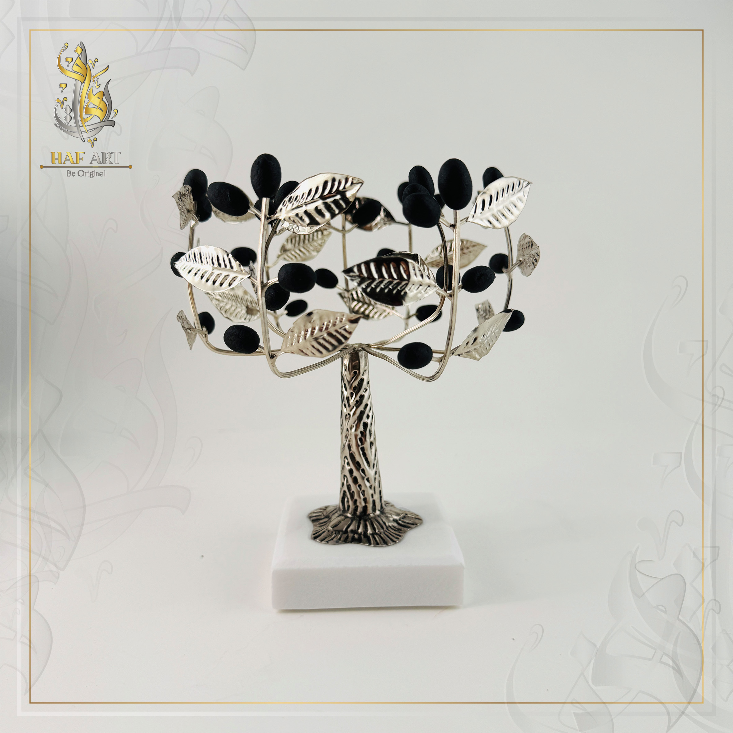 Fabriqué avec soin à partir de cuivre travaillé à la main, orné de perles d’ambre raffinées(anbar,العنبر) et posé sur une base en marbre solide, cet arbre décoratif allie tradition et modernité.