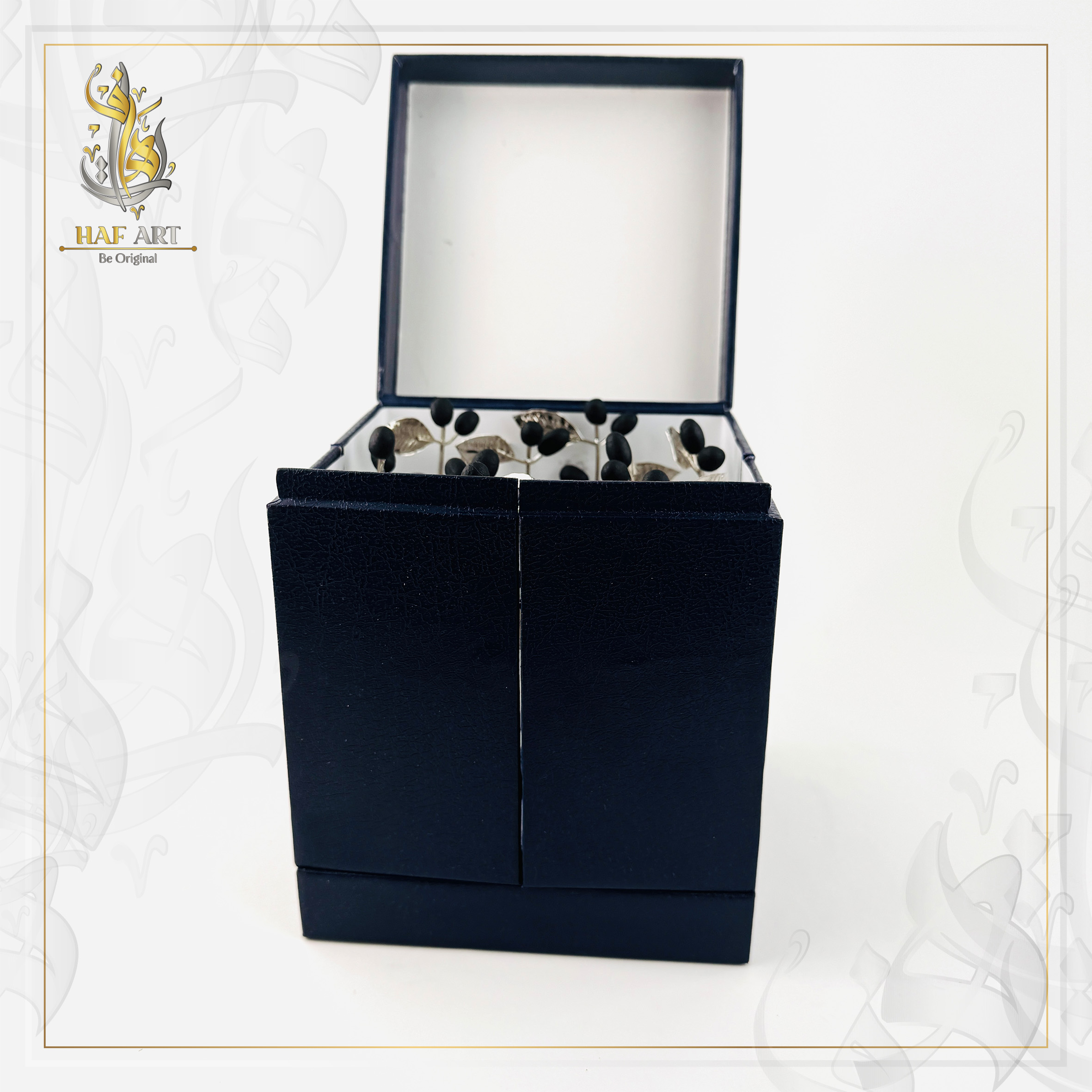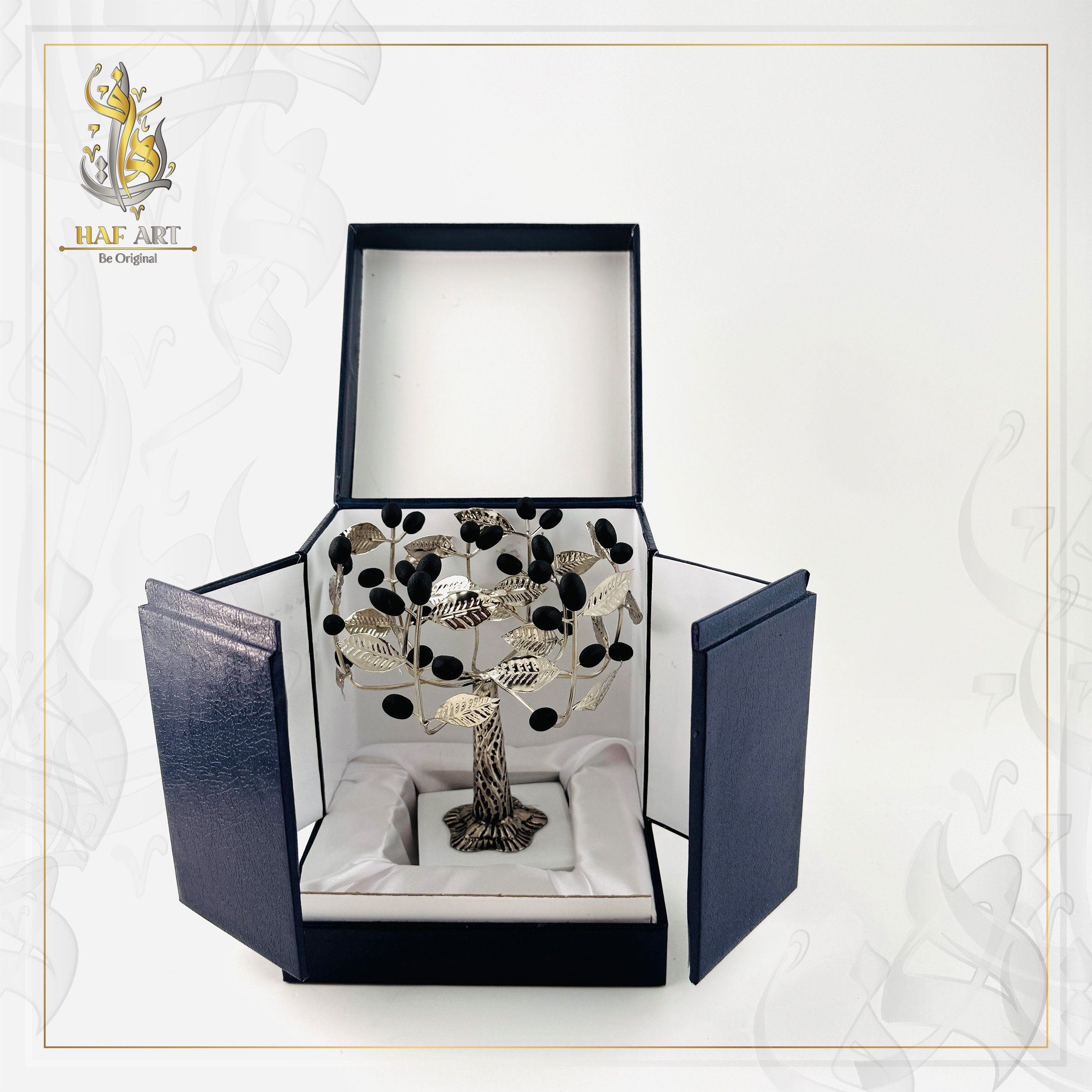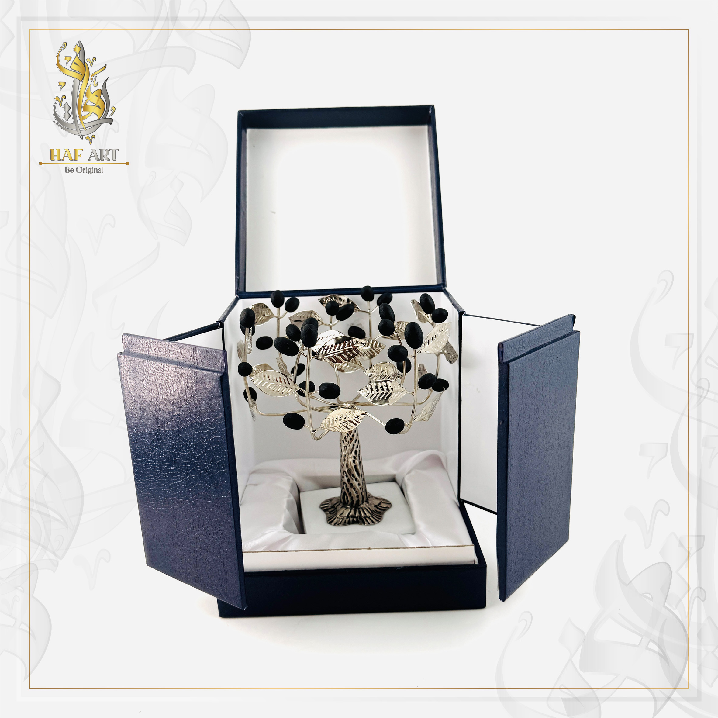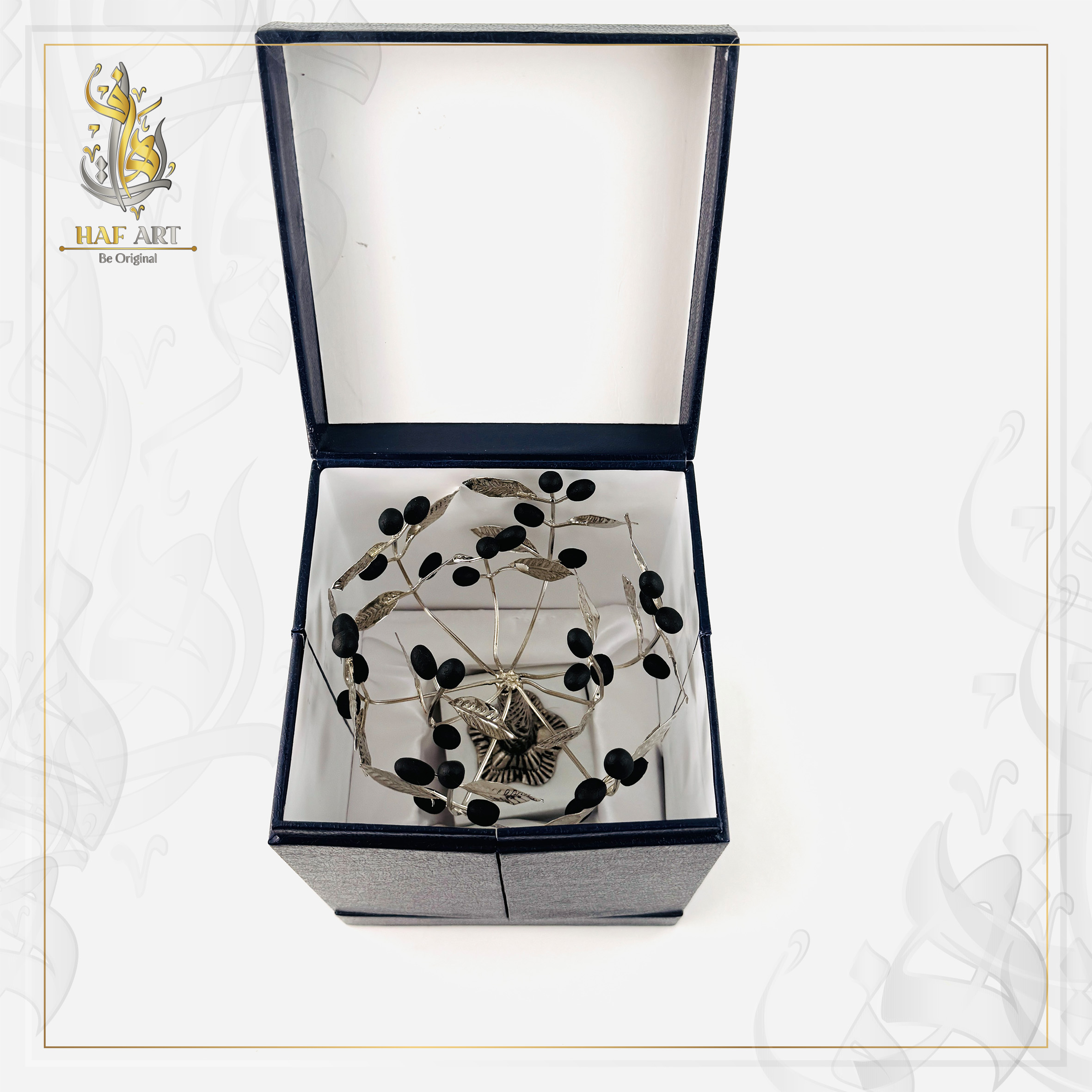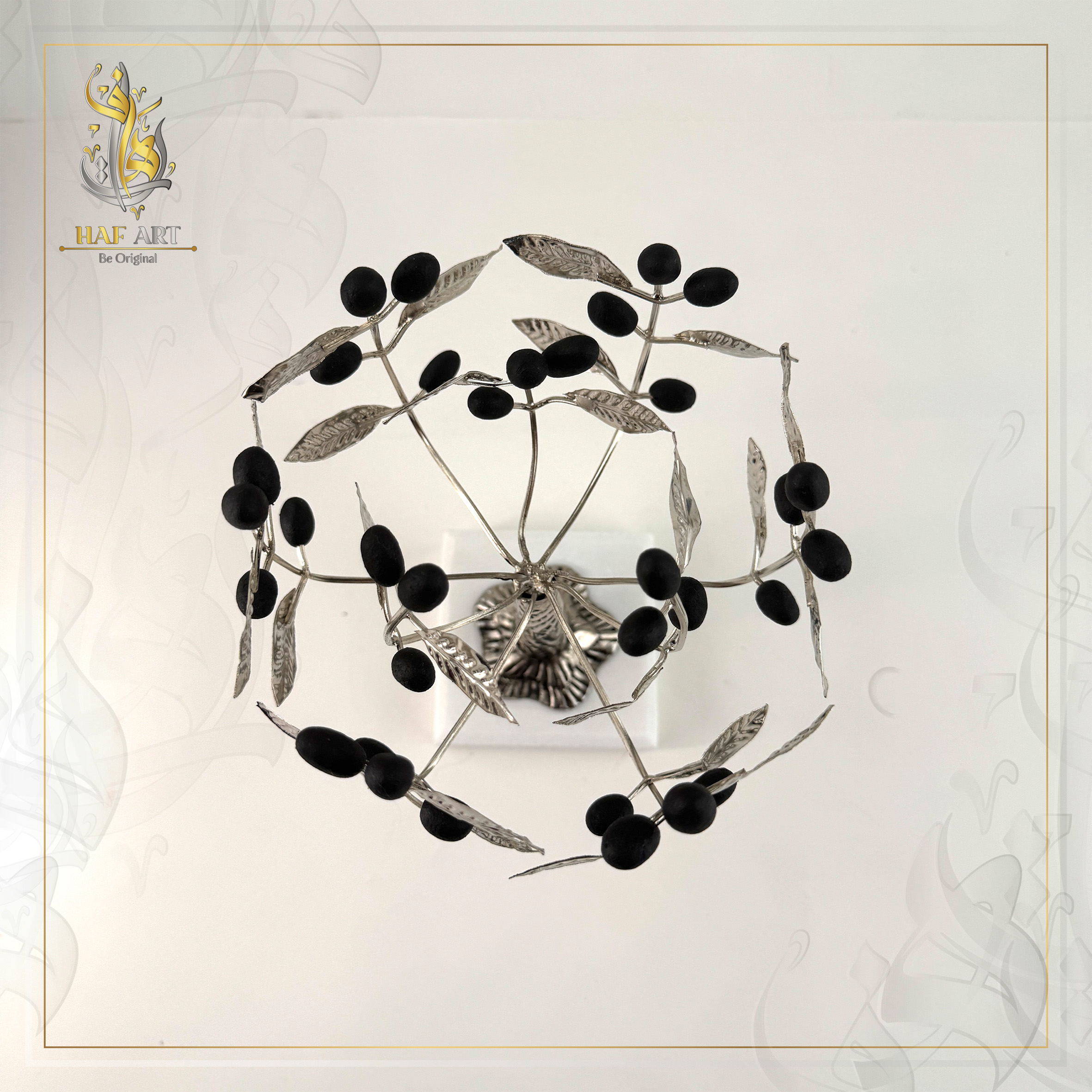 Fabriqué avec soin à partir de cuivre travaillé à la main, orné de perles d’ambre raffinées(anbar,العنبر) et posé sur une base en marbre solide, cet arbre décoratif allie tradition et modernité.